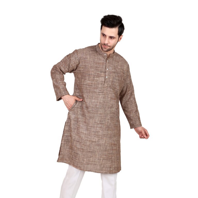 Men’s Coffee Colour Khadi Cotton Knee-Length Kurta – Full Sleeve Traditional & Casual Ethnic Wear