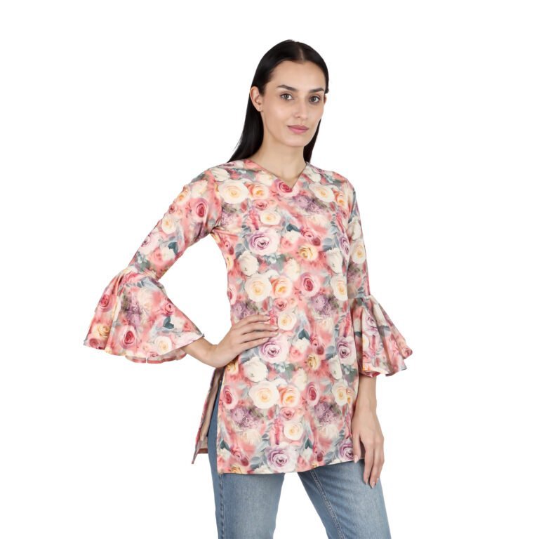 Women’s Short Cotton Kurta | White with Pink Floral | Printed Straight Fit | 3/4 Sleeves | Office, Daily & Festive Wear