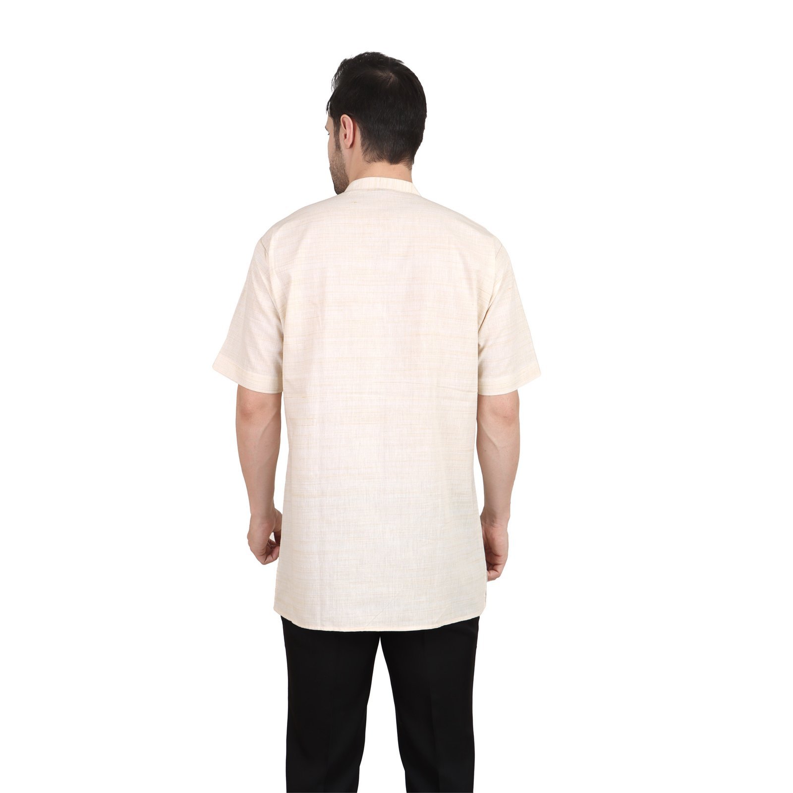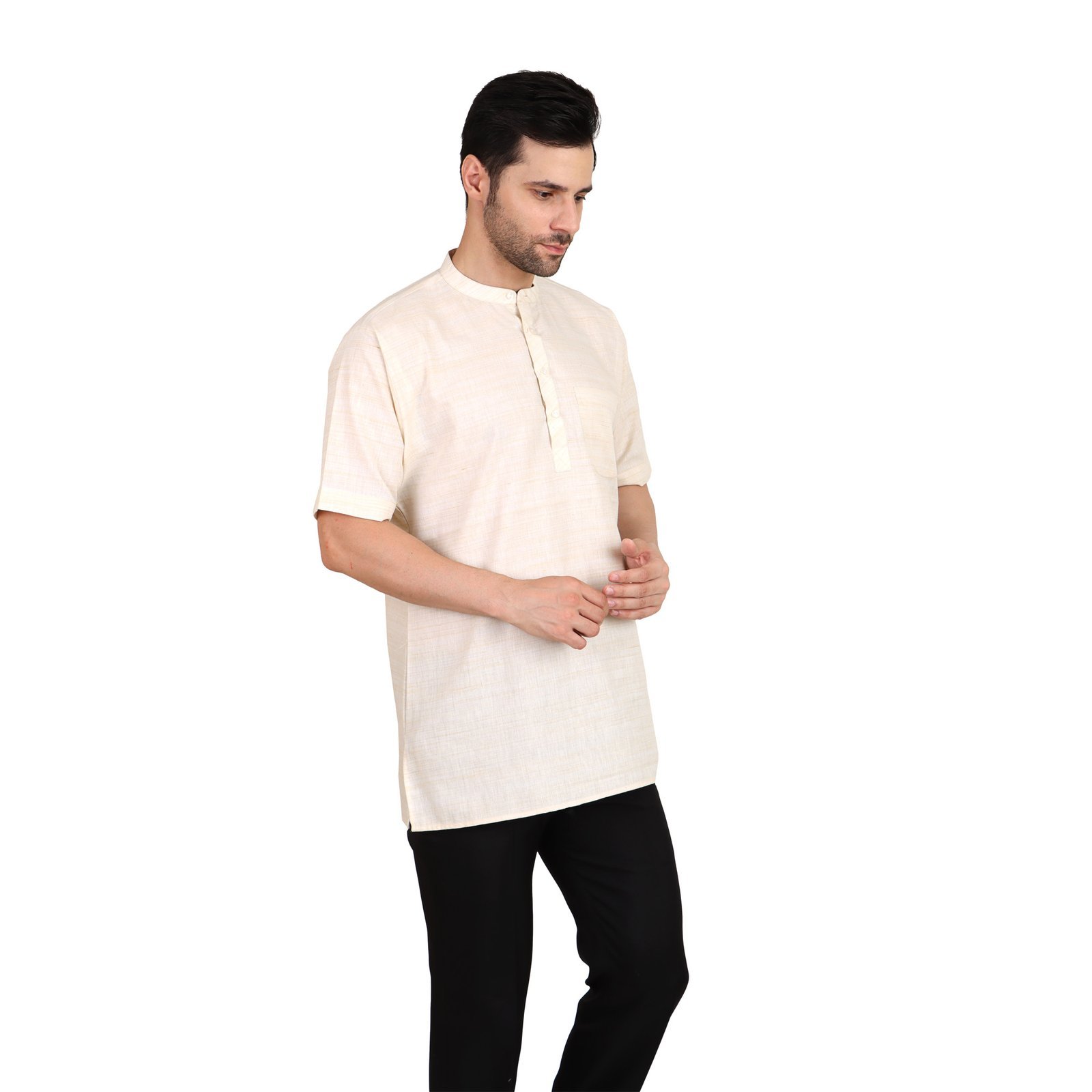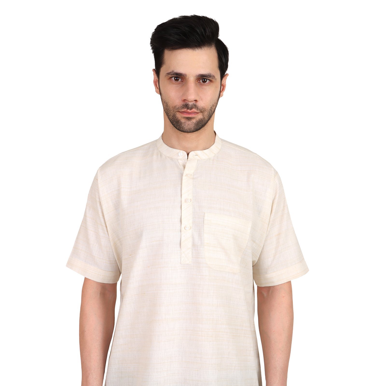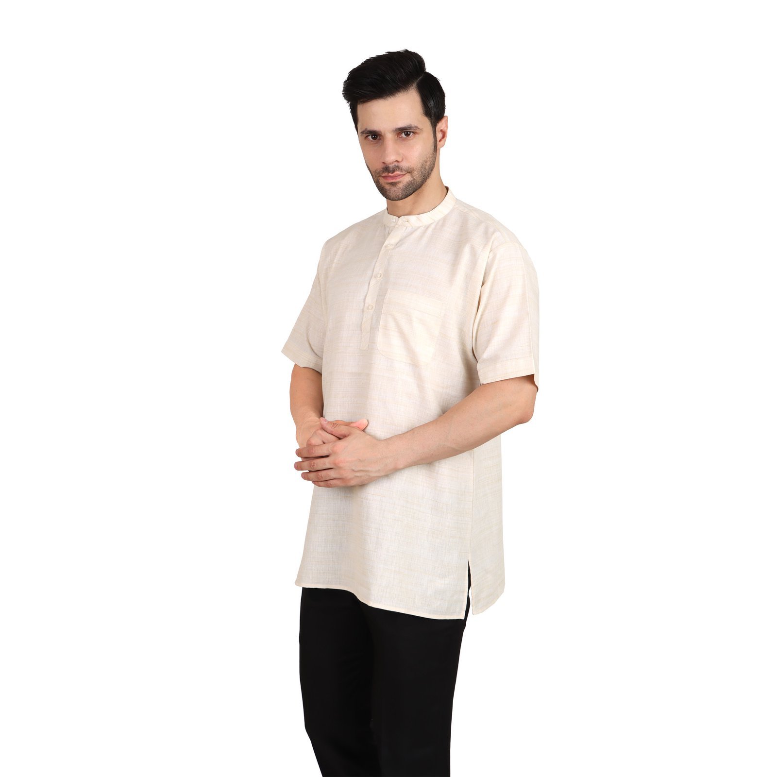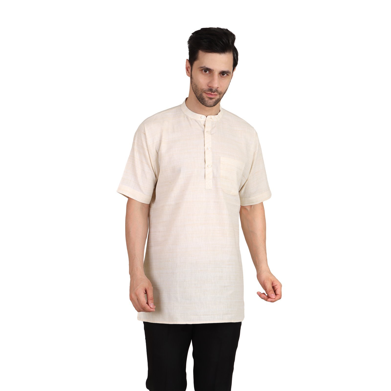 Designed for the modern man who appreciates heritage and simplicity, it showcases traditional Indian craftsmanship with everyday functionality. The versatile straight-cut design features a mandarin collar , front pocket, half sleeves, side slits, and a buttoned placket,Off-white, offering a clean, minimalist aesthetic.